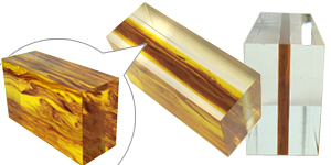 ● 柄板(色板)をサンドしたブロック クリアな厚い板にアンバーの薄い板を挟み込むと、こんな不思議なブロックが誕生します。 |